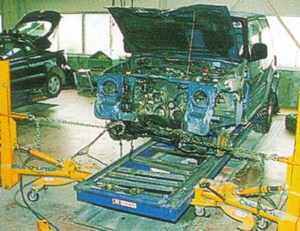 分解後、車体フレームの歪みを最新機器で微調整しながら複元。